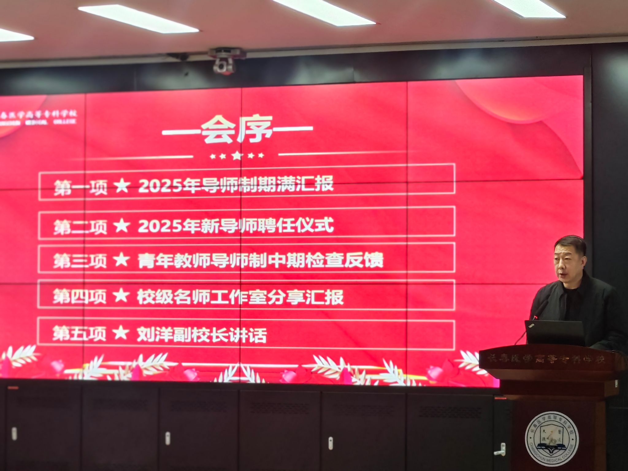 12月24日下午,我校在善教楼二楼报告厅成功举行2025年导师制期满总结、校级名师工作室中期汇报暨新导师聘任仪式。副校长刘洋、教务处处长孙晓琪出席会议,青年教师与结对导师、校级名师工作室成员及各院(部)教学主任、教学负责人共92人参会,会议由教务处副处长赵丽波主持。