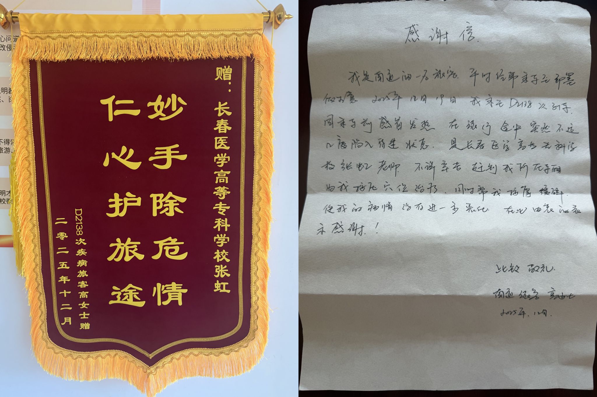 事后,张虹始终未向身边任何人主动提及此次列车救援的经历,依旧全身心投入教学与工作中,直至患者及家属为表感激,通过乘务员将一面承载着诚挚谢意的锦旗和感谢信邮寄至学校,这段暖心善举才被大家知晓,她低调无私、默默救人的大爱之举,让全校师生深受感动与敬佩。