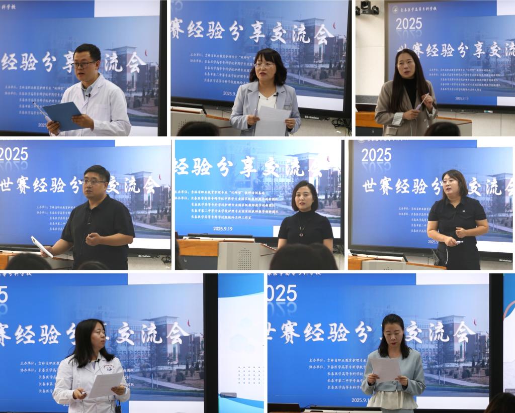 在指导教师经验分享环节,各校指导教师代表结合实战案例,从全流程视角拆解大赛指导“方法论”,为参会人员带来满满“实战干货”。我校中药教研室马千里围绕赛事规则解读、团队协作高效培养、突发事件科学处置三大核心模块,系统讲解备赛全流程的规划与执行策略;我校分析化学教研室梁芳慧聚焦参赛学生选拔的核心标准,提出“专业基础+应变能力+协作意识”的三维选拔体系,并强调跨学科团队协作对突破赛事难点的关键价值;我校外科教研室周奕彤总结经验,创新性提出“技能强化+心理疏导”双轨并行的备赛模式,指出稳定的心理素质是选手在赛场发挥最佳水平的重要保障;长春市第二中等专业学校护理系李志海分享了以“内驱力激发”为核心的备赛经验,同时阐述校企资源深度对接、教师专业能力持续提升对竞赛突破的“助推效应”;长春市第二中等专业学校口腔教研室衣丽娜结合备赛中遇到的各类突发状况,提出“将赛事标准融入日常教学”的实践路径,推动技能培养从“赛前突击”转向“常态提升”;通化医药健康职业学院生化教研室杜鹃则介绍叙事化教学法与 6S 管理模式在竞赛训练中的创新应用,为技能训练提供兼具科学性与实用性的新思路;全国大学生医学创新大赛指导教师梁敏、周婷婷:围绕“如何激发学生创新潜能、培养科研思维与实践能力”展开深度分享,为世赛指导教师优化备赛方案提供新启发。