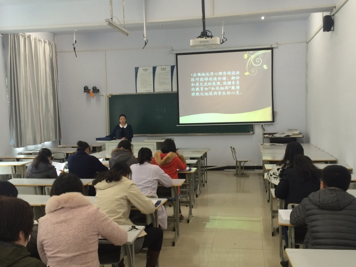 陈丹老师就心理咨询技巧在谈话中的应用,常见心理问题及解决办法进行培训。她在讲解中表明要用咨询者的真诚带动来访者,建议老师们要善于把握角色,走出自己的参考框架,做到体验来访者的内心。辅导员认真听讲解,仔细做记录,纷纷表示会将此次培训内容实践到班级心理辅导工作中去。