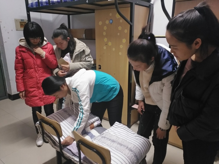 9月初护理系统一规范内务整理要求,并进行现场培训。学生们通过一周的时间练习折叠被子、整理床单、摆放用品、打理衣物等以达标准统一。在比赛展示阶段,护理系每周二展开评比活动,由各班生委组成评委组逐个寝室打分,量化评比。共评出心、蕙、恕苑42个标兵寝室,190余个标兵个人。