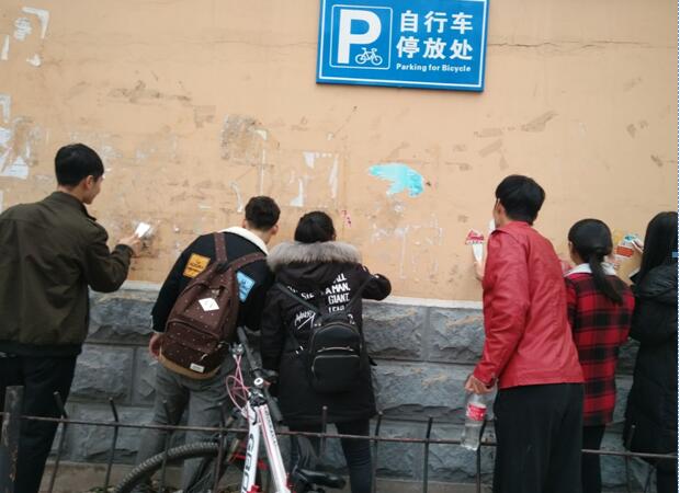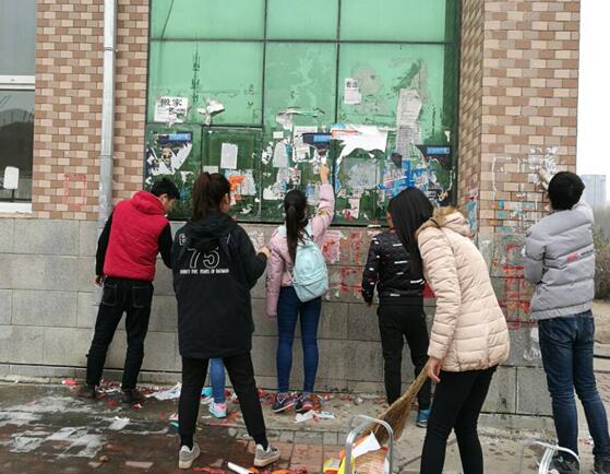 所有成员不惧风雪,不畏严寒,在全校范围内清理校园墙壁、电线杆、垃圾桶等地方的广告。同学们先将灌好的热水浸湿各类小广告,然后用小刀、铁刷等将这些顽固的“牛皮癣”一一清除。