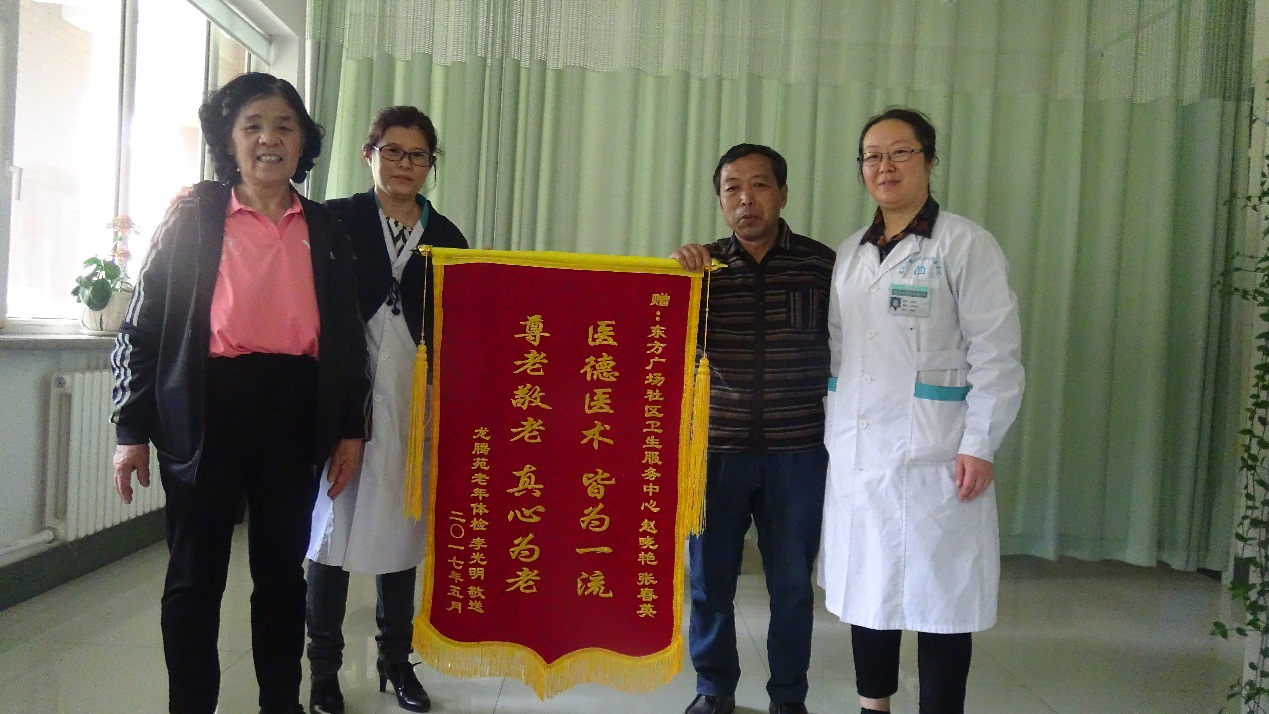 5月9日上午,社区卫生服务中心收到了居住在龙腾苑的李光明老人送来的锦旗,上面写着“医德医术皆为一流 尊老敬老 真心为老”,以此表达对医务科张春英主任及超声科副主任医师赵晓艳的感谢之情。