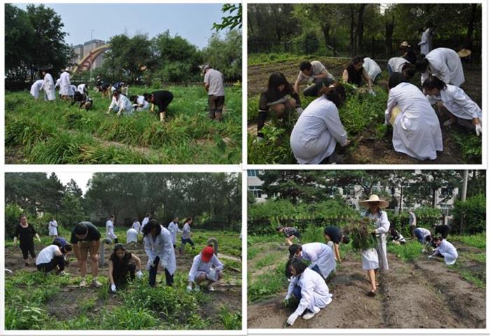 药用植物园是学校为了丰富学生第二课堂活动特批的一块教学用地。这块地由生药教研室承担种植与管理。尽管平时有兴趣小组的学生在帮忙,但临近假期,又赶上长春雨季的来临,药植园内杂草较多,如果此项工作只由生药教研室完成大概需要一周的时间,药学党总支的党员们知道了这件事情后,主动发起了此次活动。期间生药教研室的马千里、汪岩两位老师还带领大家认识了刺五加、板蓝根、十字花等药用植物,科普了其药用价值。