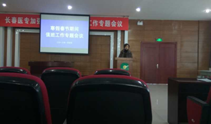 会上,办公室综合科科长李佳卉宣读了《长春市卫计委关于做好2018年元旦春节期间有关工作的通知》,办公室主任张旭强调假期值班人员肩负“一岗双责”,要树立安全责任意识,尤其今年是电暖气运行后的第一个假期,要加大巡查力度,发现问题及时上报保卫处和校领导。做到面对面交接不漏岗,尽职尽责,让全校师生度过放心的假期。最后,马龙针对值班工作从值班纪律、值班要求、安全巡查、突发事件应对等十个方面进行了培训。