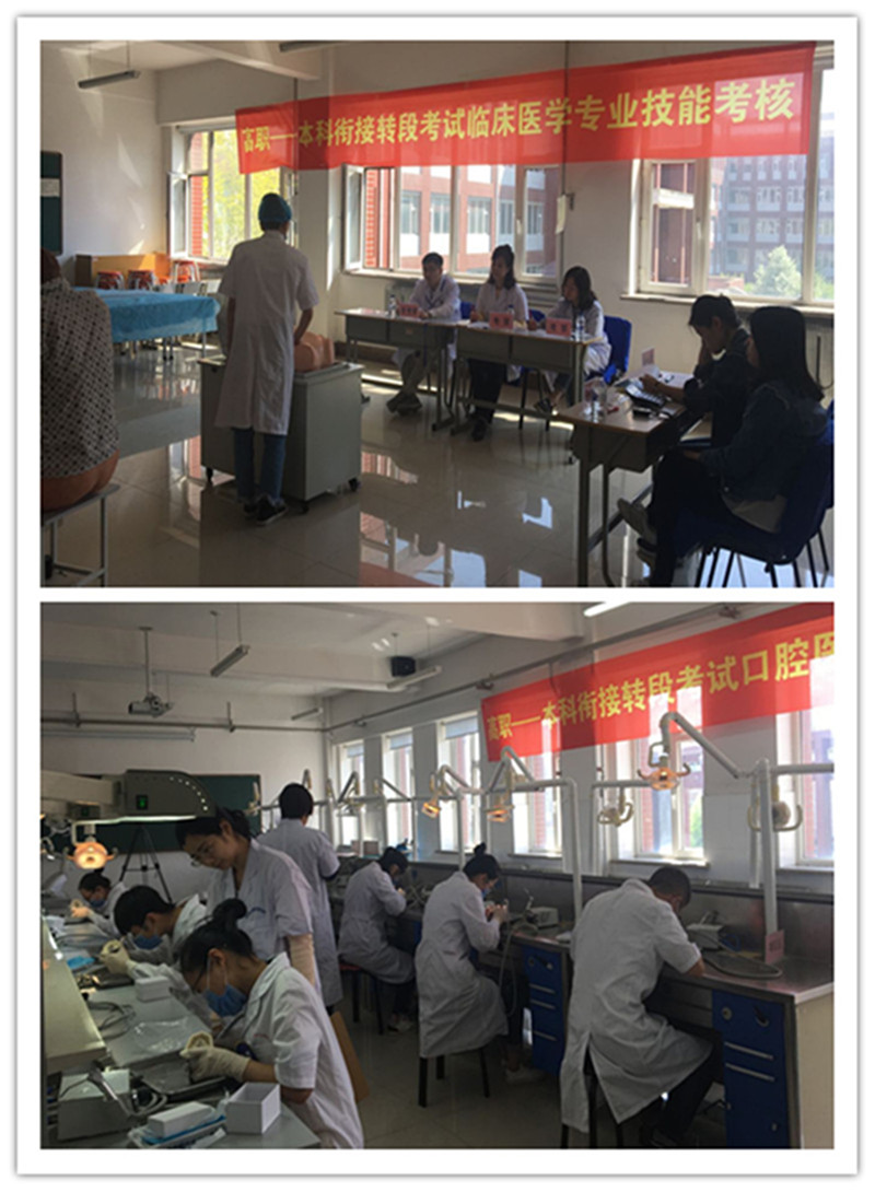 本次高职本科衔接转段考试分为文化基础水平考试和职业技能测试。衔接转段本科院校和专业分别为长春中医药大学的康复治疗技术、针灸推拿和北华大学的临床医学、口腔医学、医学检验技术专业。在临床实训中心和基础医学部共设考场19个,实践考核项目28个,共218名学生参加考试。