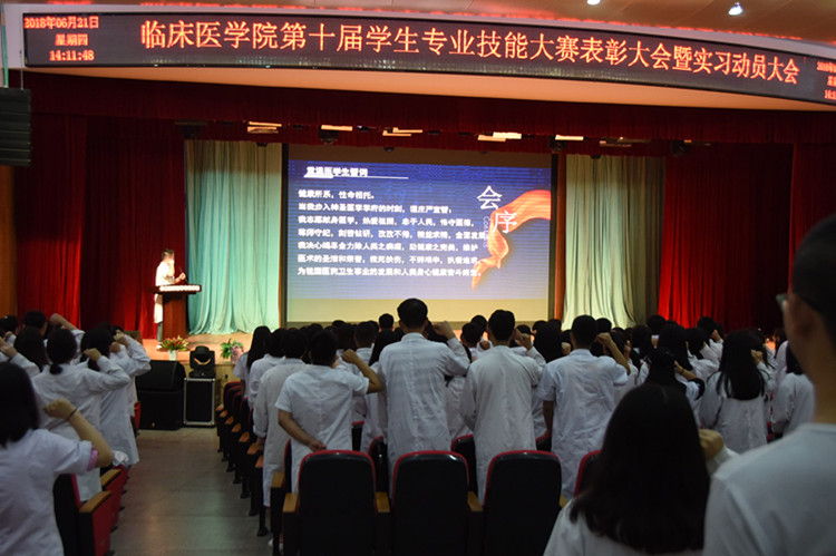随后,临床医学院召开2018年实习动员大会。实习就业办公室老师郗庆宣读《实习管理规定》,向全院的实习学生阐明了学校实习管理工作的总体要求、具体规定和实习注意事项。全体师生观看《生门》和《感动中国人物——胡佩兰》。2016级口腔专业学生李双君代表全体实习学生郑重承诺,在实习期间将按照学校的《实习管理规定》和医院的相关要求严格要求自己,认真学习临床技能,在实践工作中锤炼自己。副教授张赢予做“孩子们,放心飞吧”主题发言,将“自由”、“选择”作为两个关键词深情寄语全体学生。教师代表程坤鹏带领全体实习学生重温《医学生誓词》,铿锵有力的誓言将激励学生不断前行。