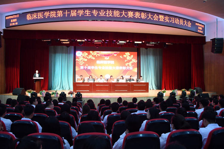6月21日下午,临床医学院在图书馆报告厅举办了第十届学生专业技能大赛表彰大会暨2018年实习动员大会。会议由学办教师刘雪菲主持。院长赵冰、党总支书记王才、副书记李淑艳出席会议。教务处处长刘洋、副处长杨智源,学工党总支书记高寒,学生处副处长刘力为应邀出席会议。临床医学院全体实习学生、实习班辅导员及专业技能大赛指导教师代表参会。
