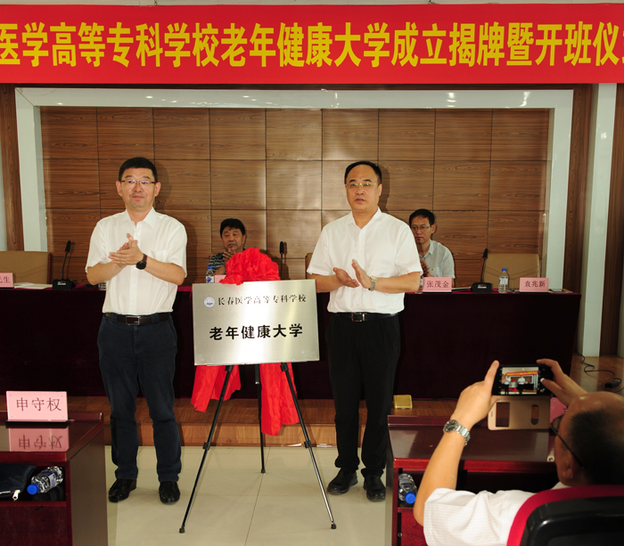 7月11日,长春医学高等专科学校老年健康大学成立揭牌暨开班仪式在长春医学高等专科学校善教楼二楼报告厅隆重举行,吉林省教育厅副厅长战高峰出席仪式并致辞,长春市教育局副局长张茂金、长春市卫生和计划生育委员会副主任温贵君和经开区管委会副主任王大鹏等相关省市领导出席仪式,长春医学高等专科学校副校长袁兆新主持仪式。