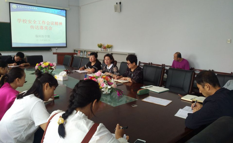为落实学校安全工作会议精神,进一步加强临床医学院安全管理,提高临床医学院教职员工安全防范意识,9月3日中午,临床医学院在三楼会议室召开学校安全工作会议精神传达落实会,临床医学院院长赵冰、党总支书记王才、副院长张虹、党总支副书记李淑艳、系办学办全体人员参加会议,会议由赵冰主持。