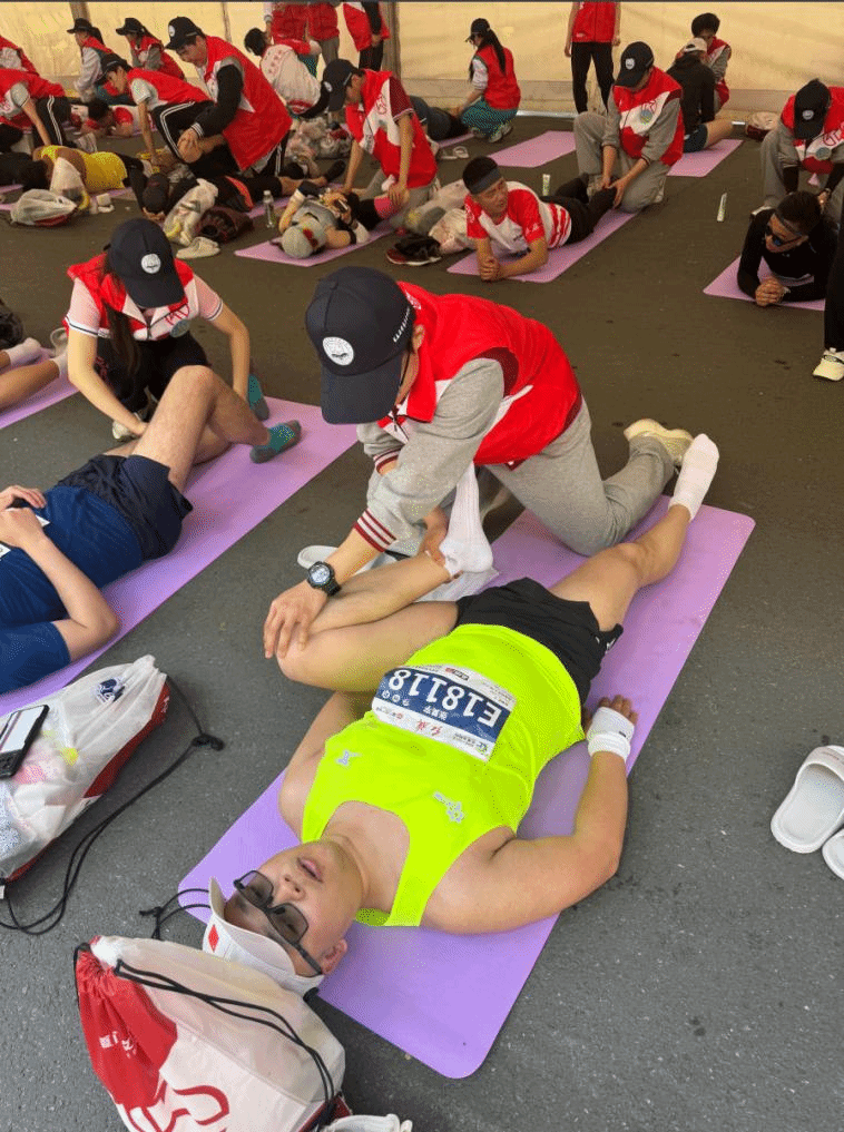 350名志愿者化身“治愈天使”,在赛后服务区的实践课堂交出高分答卷。冰池区里,他们有序引导、分发脚套,帮助完赛跑者规范使用冰池,科学降低肌肉温度,减轻运动后的炎症反应。拉伸区中,他们按照系统化操作流程,为跑者拉伸肌肉、推拿按摩,更在王昌辉、程秀宇、夏书3位专业教师的指导下,根据完赛时间调整手法力度,指尖按压配合呼吸引导,让跑者得到充分的赛后缓解。