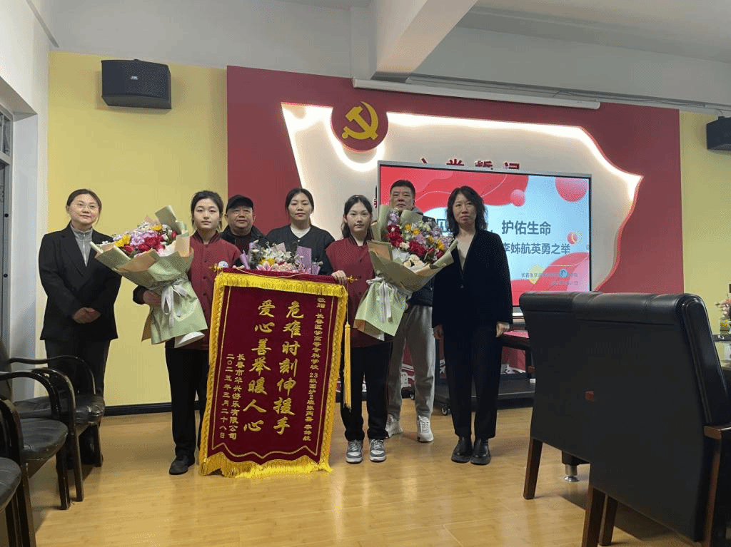 3月28日,长春医学高等专科学校迎来特殊访客——南湖公园华星游乐公司工作人员手持锦旗鲜花,专程致谢护理学院张芮嘉、李姊航两位同学。回溯至3月22日,这对“急救搭档”在南湖公园突遇男子呼吸骤停险情,凭借专业素养展开生命救援:张芮嘉持续实施规范心肺复苏,李姊航同步完成家属安抚与保护性清场,直至将该男子送至救护车二人才放心离开。她们跪地施救的八分钟,丈量着生命的长度,诠释着医者的温度。