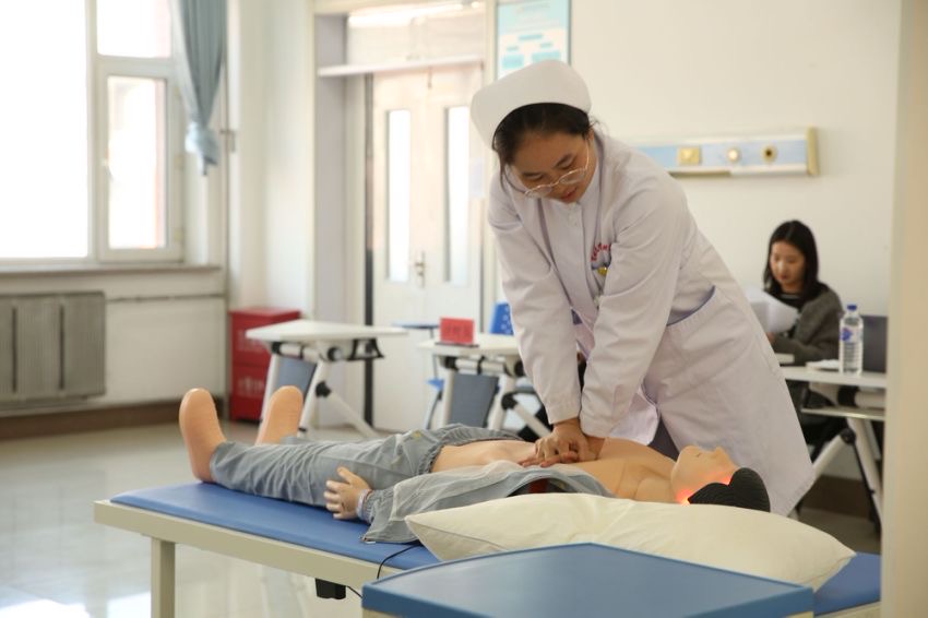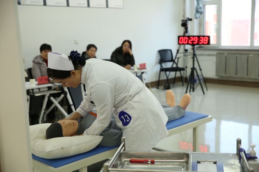 竞赛初赛由临床医学院和护理学院组织开展,37位相关专业45岁以下专兼职教师参加比赛。初赛设置临床医学、护理2个赛道,每赛道设2个考站,考核项目包括单人徒手心肺复苏术、腹部手术切口换药技术、静脉输液技术等。竞赛决赛由教务处组织开展,考核项目为单人徒手心肺复苏术。学校聘请了长春市人民医院护理部主任王洪丽、心内二科主任徐淑清、总督学周银玲、教务处处长孙晓琪、社区卫生服务中心主任张春英五位专家共同担任决赛评委,22位青年教师参加比赛,副校长孙莹莅临现场进行观摩。
