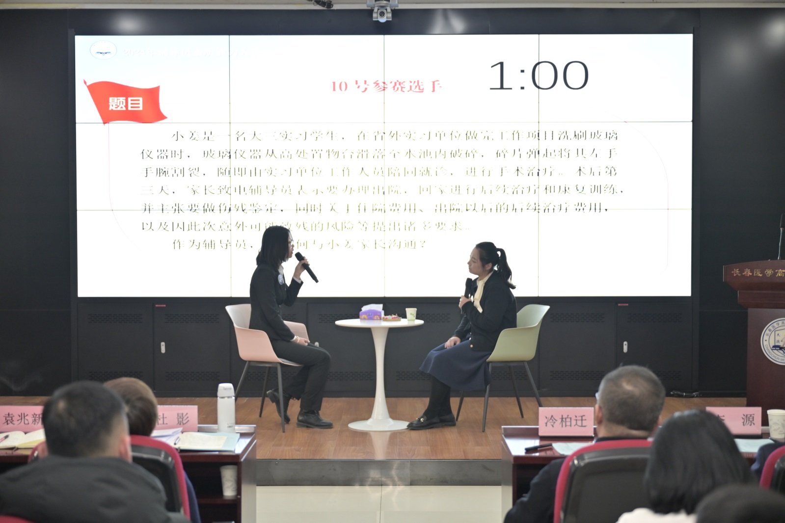 决赛以两两结对AB角互换的形式,展开谈心谈话赛项的比拼。每组选手抽取题目再现案例情景,谈心谈话6分钟后,主讲辅导员进行2分钟案例总结,全面分析个别矛盾及成因,提炼共性问题及解决方案。本次比赛选题紧扣学生管理日常的重点、难点,包含心理危机事件干预、网络舆情应对、寝室矛盾调解、学生干部作风引导和家校纠纷处理等多类别问题,需要参赛辅导员以相关政策法规为依据,结合学生呈现出的思想动态和日常行为特点,对案例进行有效梳理和解析。