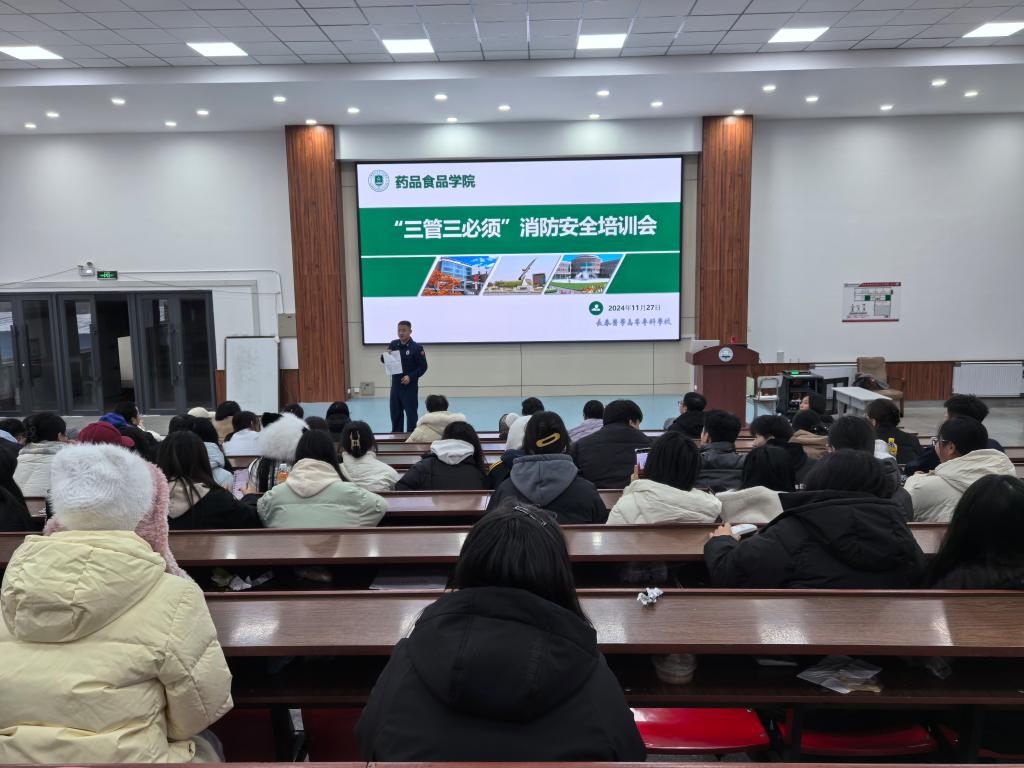 为进一步增强我院师生的安全意识,并提高他们应对火灾等紧急情况的处理能力,2024年11月27日下午,药品食品学院在达仁厅开展了“三管三必须”消防安全培训。药品食品学院党总支书记高雅静、学院教师及在校学生100余人参加了培训。培训会由药品食品学院教学负责人汪岩主持。