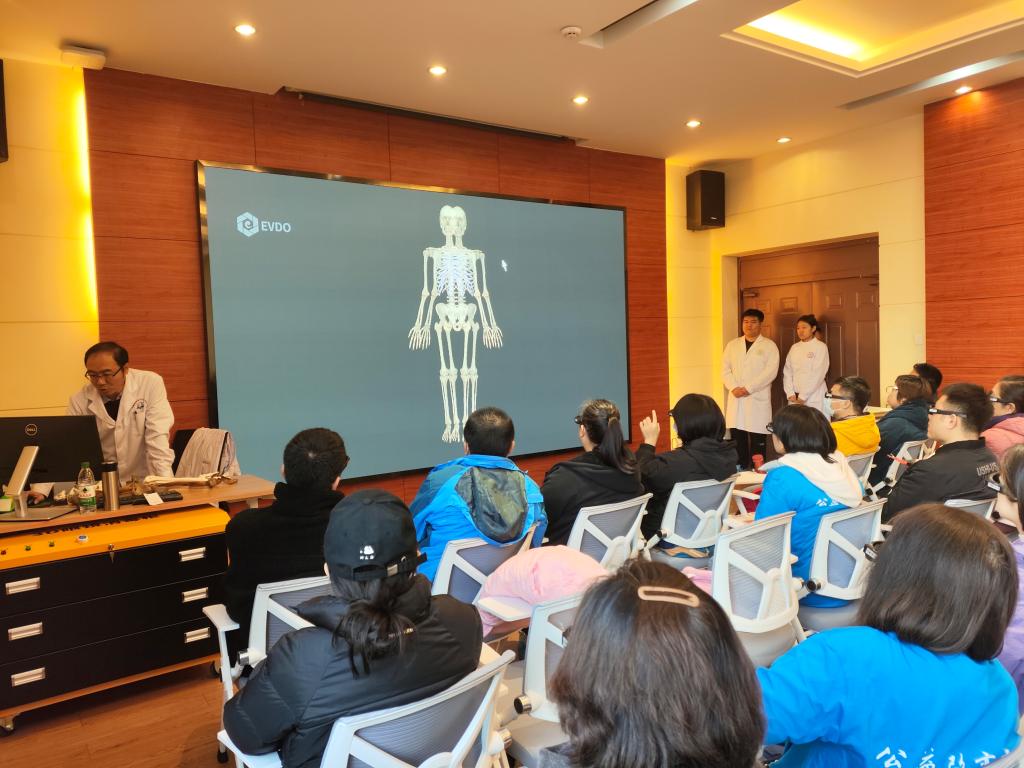 随后,张晨老师为参观者们开展了一场人体知识科普讲座,他以“为什么我会长高而爸爸妈妈不会?”“为什么要加强营养和锻炼?”“为什么老师让我端正坐姿?”三个问题贯穿整场讲座,为参观者们详细介绍了骨骼的形态与特点等,随后借助3D设施,为参观者们介绍了人体的全身骨骼系统。参观者们积极互动,现场气氛热烈。