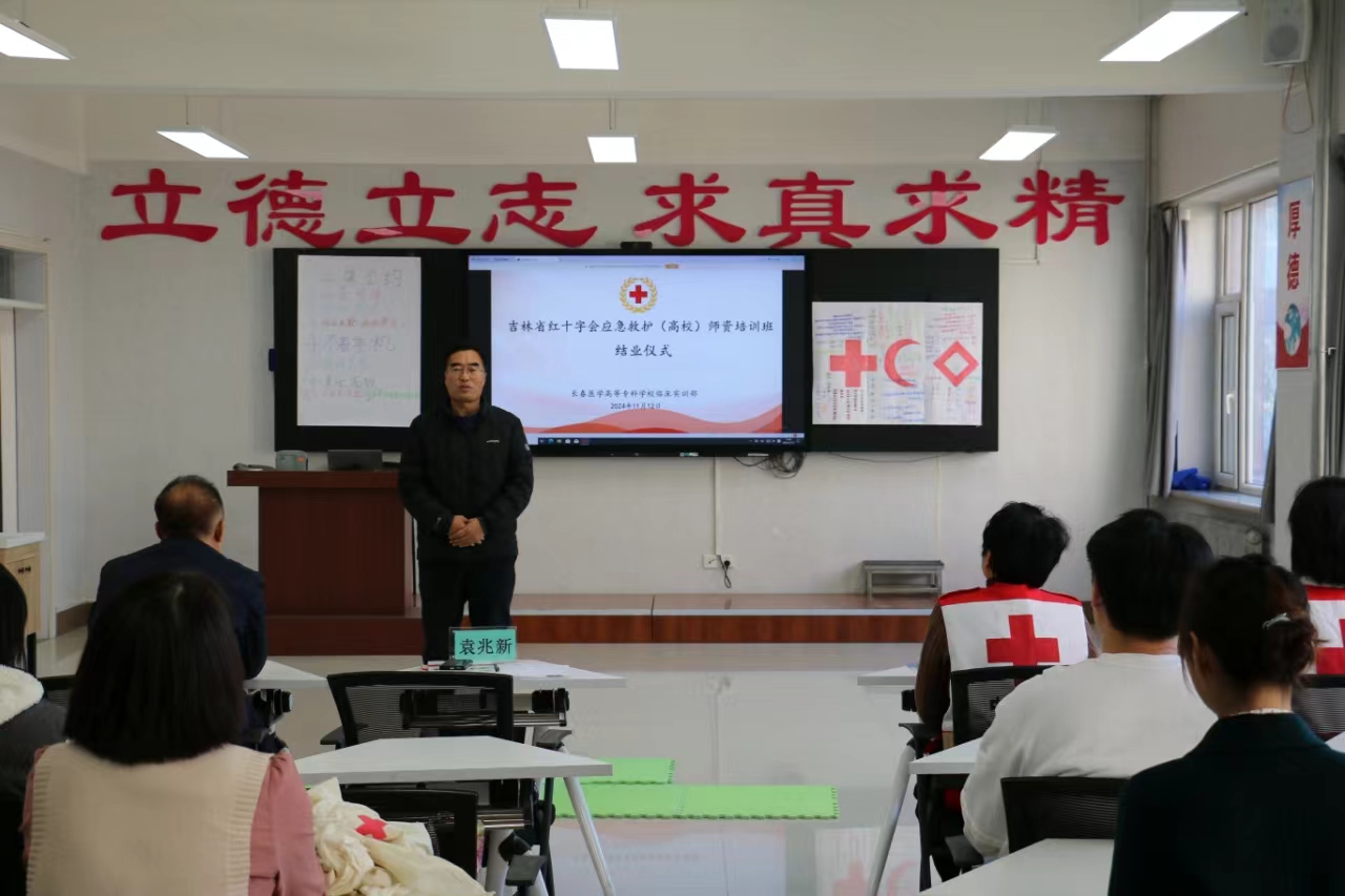 11月12日,我校与吉林省红十字会联合举办的首期“救护师资培训班”圆满结束。校长袁兆新、党委副书记高洪宇出席结业仪式。两位校领导与培训专家和参训学员们一起,现场观看了培训过程纪录片,观摩了8名学员进行心肺复苏、绷带包扎、三角巾包扎等项目的学习汇报展示。参与展示的学员精神饱满、操作娴熟,按照要求顺利完成急救操作,得到了校领导和专家的好评。袁兆新在结业仪式讲话中表示,感谢省红十字会对我校急救教师队伍建设的支持,也祝贺各位参训学员顺利通过理论考试、技能和试讲考核取得救护师资证书,希望第一批学员能够起到引领带动作用,为全校急救知识和技能的普及作出贡献。