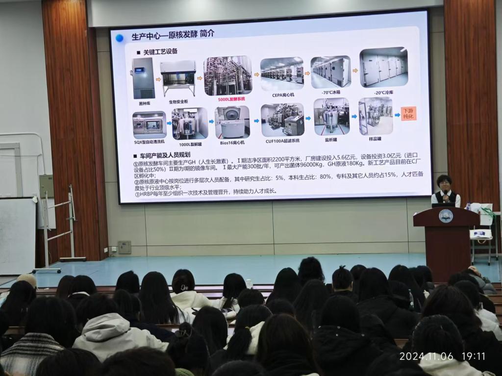 为了让2023级学生深入了解企业发展前景与就业趋势,帮助他们准确对标行业需求,增强职业竞争能力,11月6日晚,药品食品学院在3348教室开展了“准确进行自我定位,合理规划职业人生”专题讲座,本次讲座由长春金赛药业有限责任公司生产部经理、我校2006届生物工程专业校友吴瑕与学生进行交流分享,讲座由学院实习就业老师梁远主持。