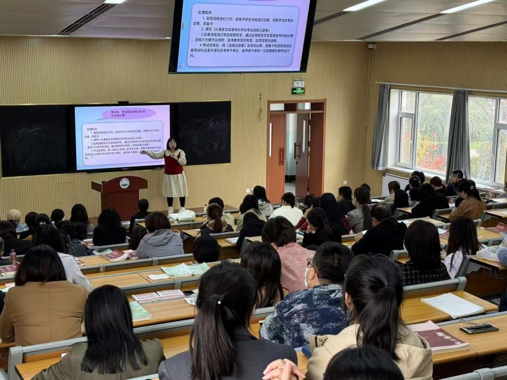 根据学校党委部署安排,自本学期起,学校校内考试监考工作将由全校在职教职工共同承担。为此,教务处在前期印发了《长春医学高等专科学校教学类考试考务人员管理规定》(长医高专校字〔2024〕53号),为进一步解读文件精神,引导全校教职工熟悉监考工作流程,明确监考工作要求,提高监考工作能力,2024年10月14日下午,教务处在善学楼1214教室组织召开监考工作培训会。教务处处长孙晓琪、全校各行政处室及院部未承担过校内考试监考工作的老师120余人参加培训会,会议由教务处副处长张义英主持。