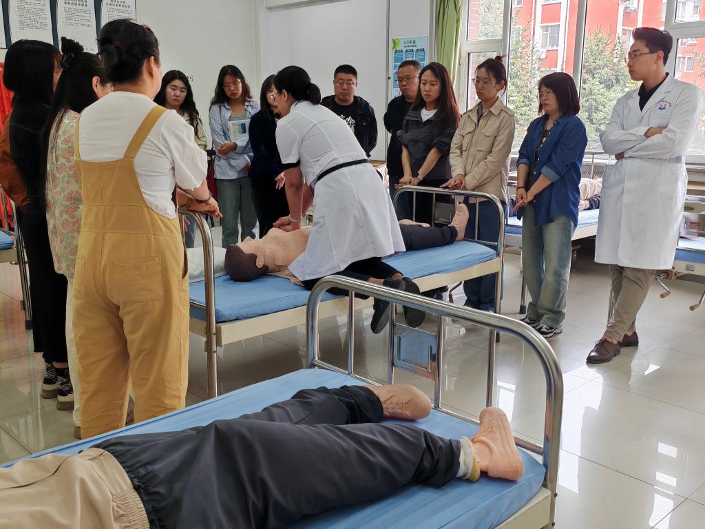 杨洋、杨丽娜分别在两个实训室讲解了心搏骤停的判断方法,成人实施徒手心肺复苏的流程、方法、注意事项、复苏成功的标准及终止操作的条件,并逐步进行了演示。演示后,学院教师和辅导员分组进行操作训练,指导教师在一旁耐心指导,细致入微地讲解操作流程、纠正错误动作,加深大家对规范动作的理解,加快对心肺复苏技能的掌握。