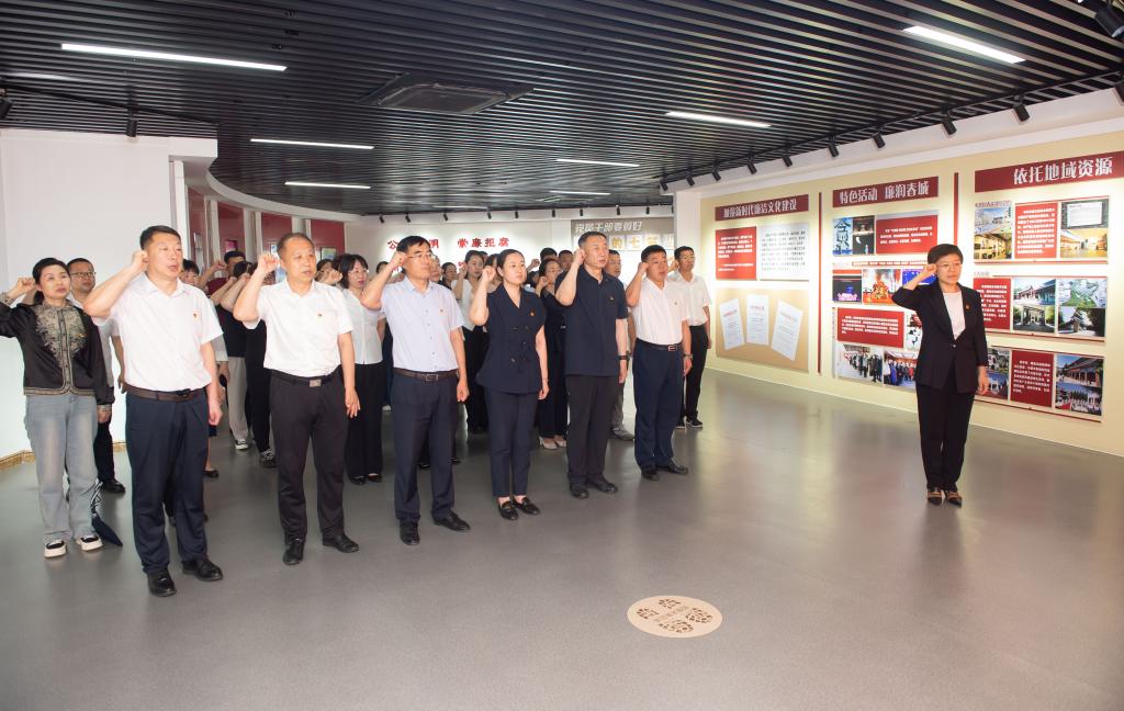 在讲解员的带领下,全体党员干部观看了《全面从严治党永远在路上》的专题片,参观了主题展厅。通过图文讲解、影片观看,尤其是一系列的案例警示,参观人员深切体会到违纪违法给党和国家事业造成的严重危害,震撼心灵、洗礼灵魂、净化思想,更加深入领会了《中国共产党纪律处分条例》修订的重要意义。最后,全体参观人员整齐列队,面向党旗,高举右拳,重温入党誓词。