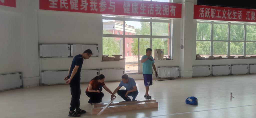 两位领导分别去到了三楼篮球馆,二楼羽毛球馆、乒乓球馆,一楼的健身馆和形体馆及室外的篮球场等进行实地勘察。在体育馆改造项目现场,校长详细询问了项目负责人关于项目进展情况和施工过程中遇到的困难和问题,详细了解了枫木专业运动地板和羽毛球地胶在日常使用和养护中的注意事项,并对篮球场、羽毛球场等运动场地的配套设施进行了细致的检查。