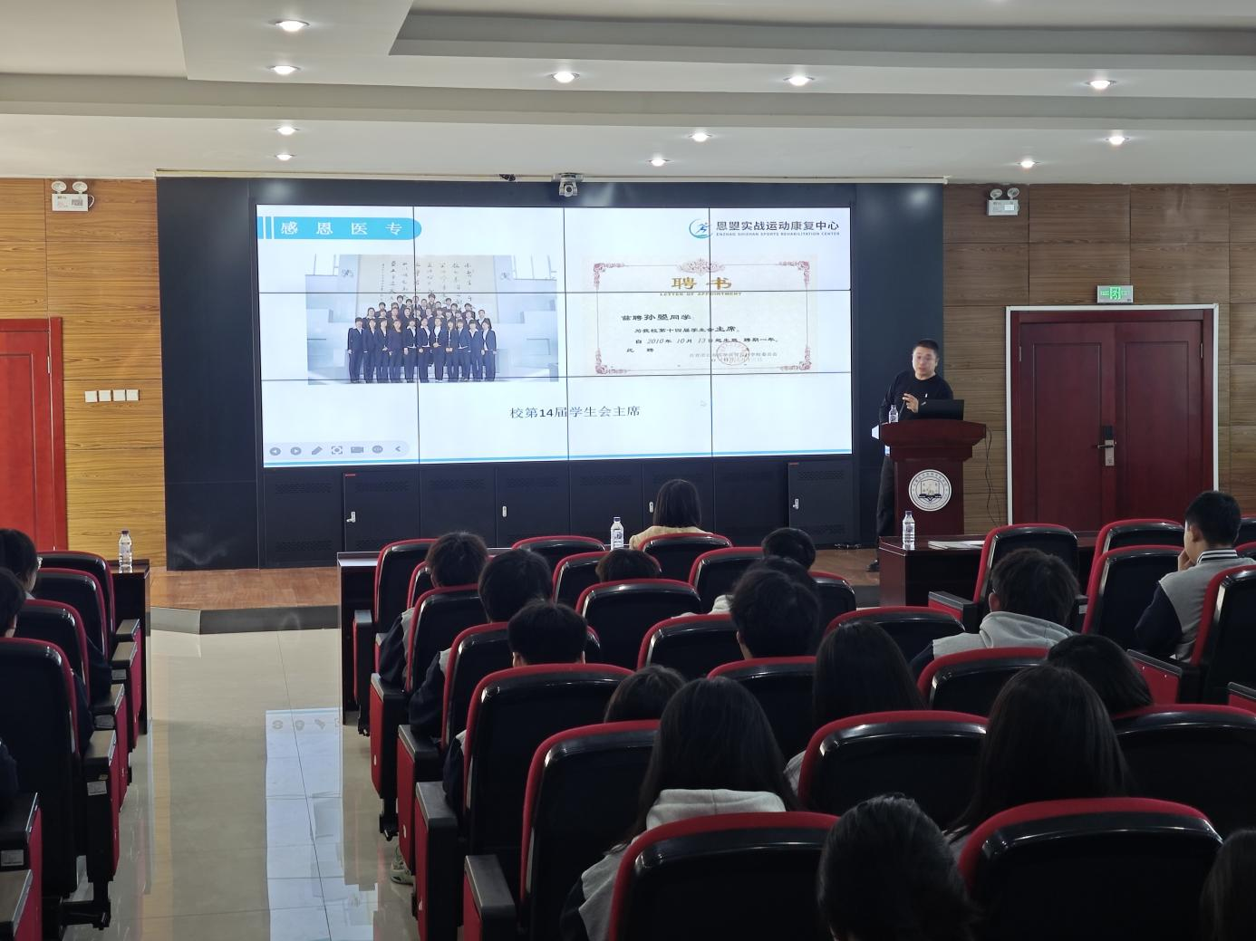 孙曌介绍了自己在医专所获得的荣誉以及医专对他影响,分享了自己职业生涯的历程以及未来规划,并从行业企业需求出发,鼓励同学们在校期间努力学习专业知识技能,做到理论扎实、技术过硬,才能更好的适应社会。