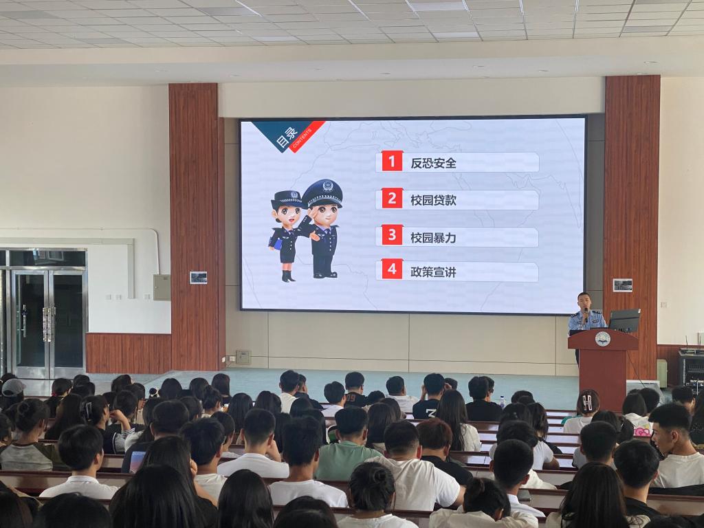 为扎实做好校园安全工作,全面加强新生入学后的安全教育,切实提高学生的安全防范和自我保护能力,9月9日,保卫处在药品食品学院达人厅开展了新生安全教育的第一课,特邀长春市公安局经开分局田海龙警官担任主讲,经开分局内保大队孙海涛警官、药品食品学院学办主任董凤鸽、新生班辅导员及841名新生参加本次活动。