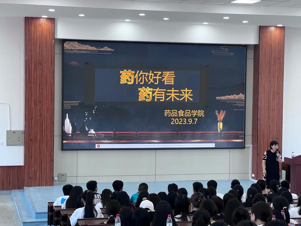 王月珍为新生们讲授了开学第一课,她向同学们介绍了药品食品学院的历史沿革、专业设置、师资力量、各专业及就业前景等基本情况,勉励新生珍惜韶华、不负时代、勤学实干、奋发有为,争做药院好青年。