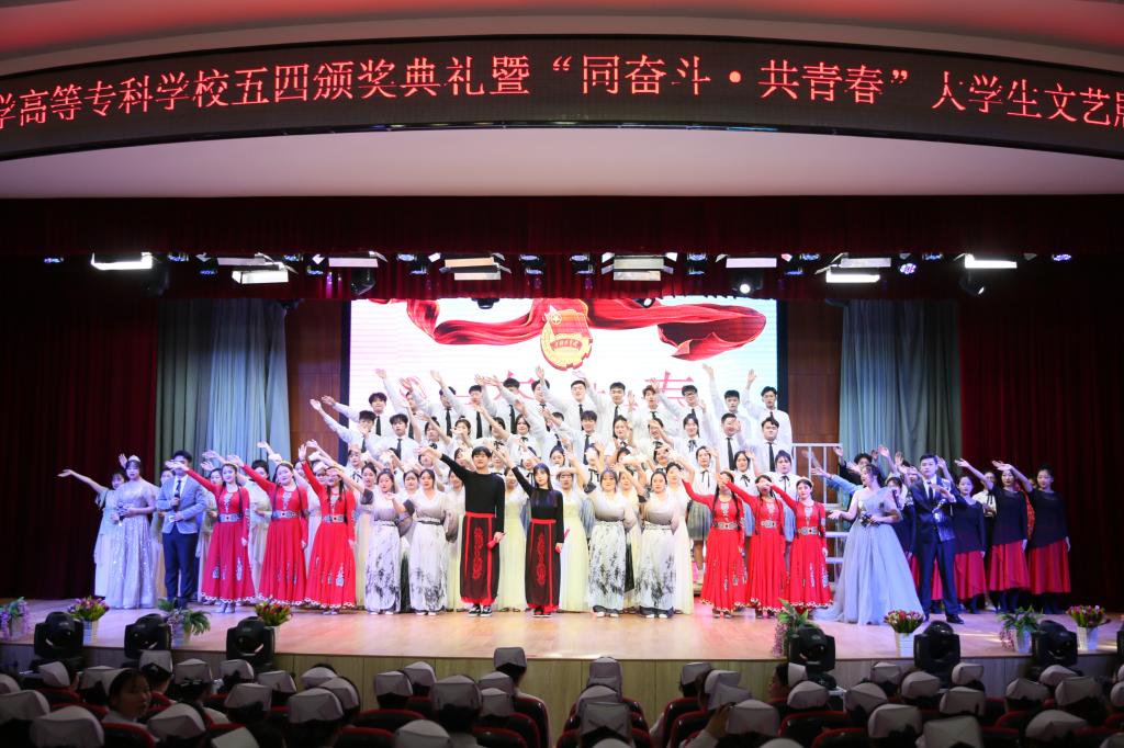 颁奖典礼结束后,一支青春洋溢的当代舞《医护青春》拉开了文艺展演的序幕。激昂振奋的音诗画表演《青春中国》和情景小合唱《青春》,展现了一代代共和国功勋青年时的意气风发,激励着每一位新时代的建设者和接班人为实现中华民族伟大复兴接续奋斗;原汁原味的维吾尔族舞蹈《石榴红了》、含情脉脉的当代舞《如愿》和唯美优雅的民族舞《采茶》,通过不同的表现形式、不同的风格韵味,演绎了在中国共产党领导下国家繁荣富强、人民安居乐业的幸福生活;校园剧《与信仰对话—梦回红船》讲述了中国青年与历史、与信仰对话的故事,歌颂了为中华民族振臂高呼、舍生忘死的青年志士;舞蹈串烧《山河华夏》掀起了展演的高潮,将深受青年学生喜爱的动感爵士舞与柔美的中国古典舞相结合,一刚一柔的完美融合点燃全场气氛;演出在大合唱《明天会更好》中落下帷幕,歌声鼓舞着医专学子踔厉奋发书写青春篇章,让青春助力高质量发展,在奋斗的新征程中走在前列。
