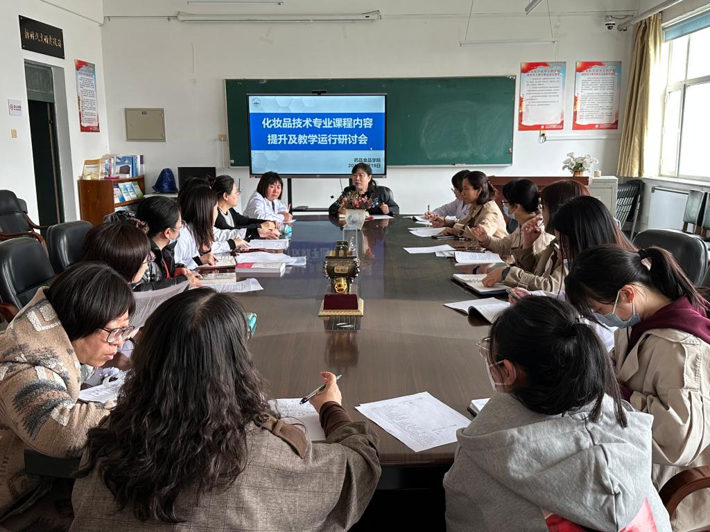 4月19日下午,药品食品学院在药学楼六楼会议室召开化妆品技术专业课程内容提升及教学运行研讨会,药品食品学院院长于景龙、化妆品技术专业负责人马春娟、各教研室主任及部分任课教师参加研讨会,会议由药品食品学院教学副院长王月珍主持。