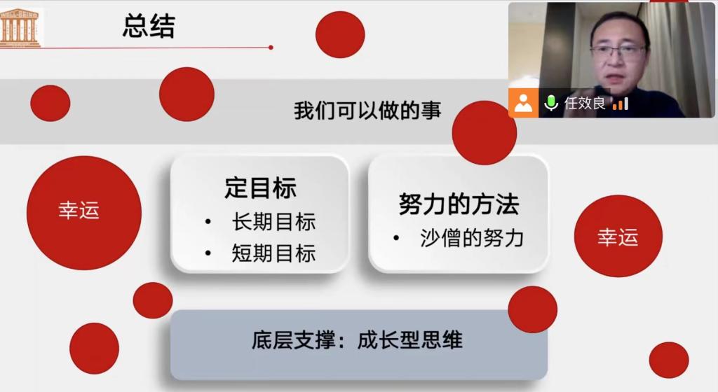 任效良以问题“哪个描述最像你?”作为讲座的开始,通过互动了解同学们的心理状态和自我认识,进而引出“成功=努力+运气”,“‘会’努力,能更幸运”的观点。他将“会努力”引申为“定目标”、“努力的方法”和“成长型思维”。任老师详细讲解了制定短期目标的SMART原则,并结合实际例子教会同学们如何制定正确的短期目标并为此付出努力。