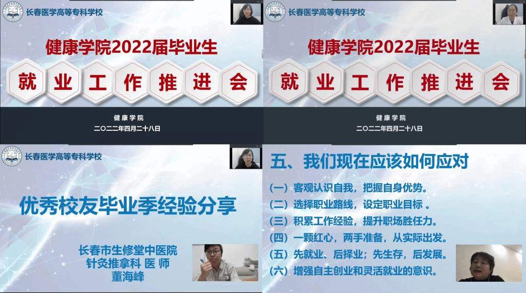 为抓住2019级实习结束的关键期,让学生立足当下、明确目标、找准定位,理清就业季工作推进的节奏和脉络,更好地精准施策, 4月28日晚,健康学院在线上举行了“健康学院2022届毕业生就业工作推进会”。健康学院院长季东平、毕业班辅导员老师和全体2019级学生参加了在线会议,招生就业处副处长高雅静、校友董海峰应邀参会。会议由健康学院学办主任雷明主持。