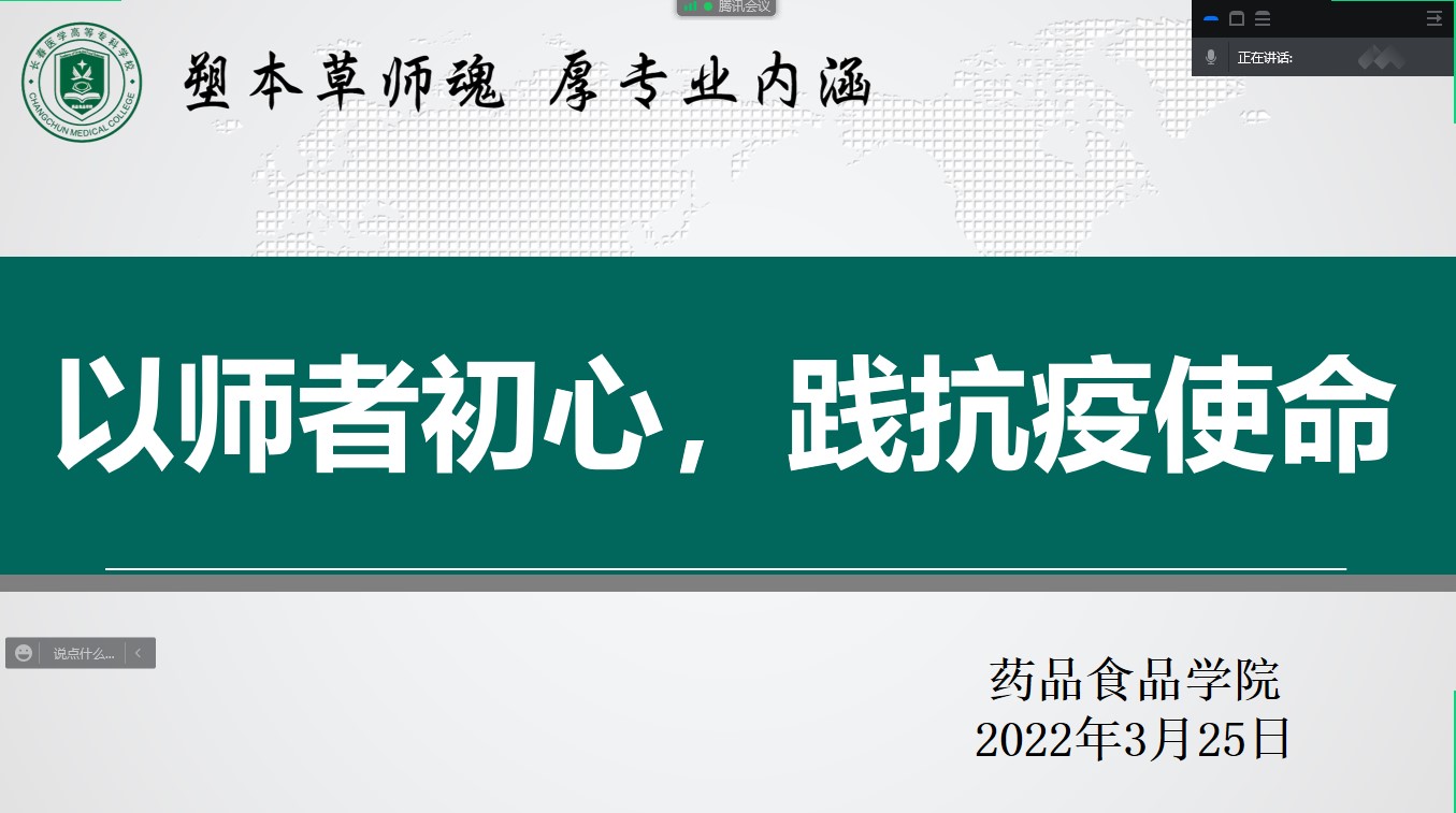 为贯彻落实学校关于线上教学的相关要求,发挥教师在授课过程中的思想引领作用,进一步统一思想,提升教师线上教学能力,共同探讨将防疫内容融入线上教学的方式与方法,药品食品学院于3月25日晚举行线上交流会。药品食品学院院长于景龙,副院长王月珍以及全体专兼职教师参加会议。