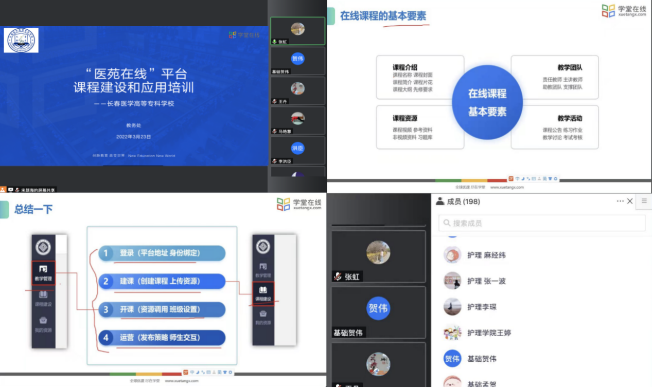 为贯彻落实吉林省教育厅《关于进一步加强疫情防控期间全省高校在线教学规范管理工作的通知》(吉教高〔2022〕8号)和学校印发《疫情防控期间在线教学规范管理工作方案的通知》(长医高专校字〔2022〕11号)文件精神,进一步规范学校在线教学管理,更好的指导老师使用“医苑在线”平台建课和应用,解决教师在使用平台时遇到的各种疑难问题,3月23日下午,教务处利用单周周三各院部业务学习时间,通过“腾讯会议”网络直播的形式,组织全校专兼职教师参加了“医苑在线”平台课程建设和应用业务学习活动。会议邀请了“学堂在线”东北区培训师焦克俊作专题讲座。教务处处长张虹,各院部主任、教学副主任及全校专兼职教师参加了业务学习活动。会议由教务处质量工程科科长郝强主持。