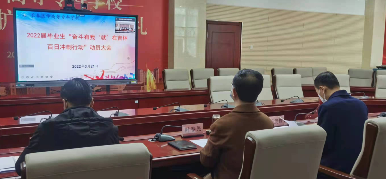 3月21日上午,我校召开2022届毕业生“奋斗有我 ‘就’在吉林百日冲刺行动”动员大会。会议采用线上、线下相结合的形式召开,主会场设在善教楼二楼会议室,分会场在腾讯会议上。党委副书记、校长袁兆新,党委副书记陈贵锋,各相关职能处室、各学院负责人、就业教师及2022届毕业班辅导员参会。会议由学校党委书记叶春民主持。