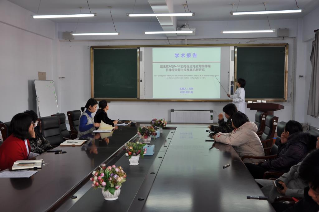 基础医学研究中心主任方琳以《激活素A与神经生长因子(NGF)协同促进鸡胚背根神经节神经突起生长及其机制研究》为题,从课题的研究思路、研究方法、研究内容及研究成果方面进行了介绍。学术分享逻辑严谨、思维清晰、研究创意丰富,令与会人员受益匪浅。高寒希望以此次讲座为引导,每位教师能够明确自身发展定位,拓展科研思路,利用业余时间尤其是寒假阅读文献,为明年申报校级、省级课题提前做好充足准备。