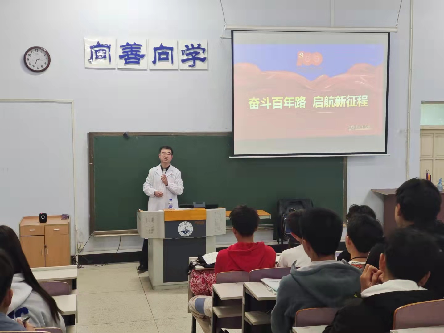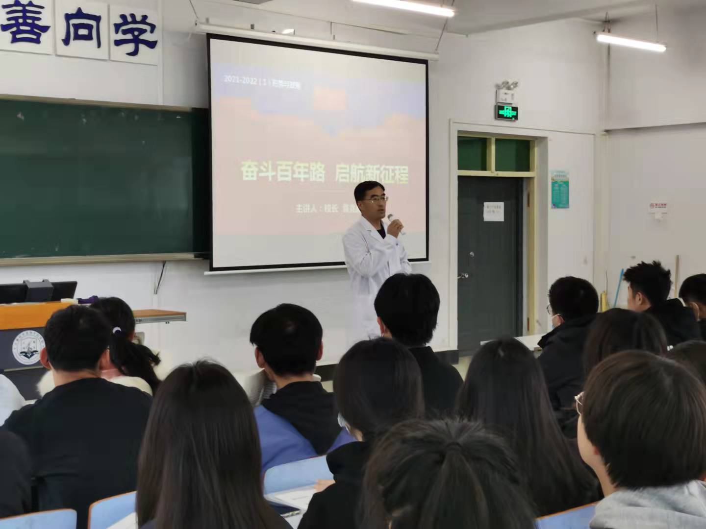 校长袁兆新以“奋斗百年路 启航新征程”为主题,用丰富的史料、详实的数据结合自己的深切感悟,带领同学们共同回顾了中国共产党为人民谋幸福的百年奋斗史,深刻阐释了一百年来中国共产党团结带领中国人民创造的伟大成就。他对同学们提出殷切希望,要以无悔的青春成就伟大的梦想、以忠诚的行动干出伟大的事业,以过硬的本领履行伟大的使命,使青春在新时代迸发出更加耀眼的光芒、更令人感动的魅力。