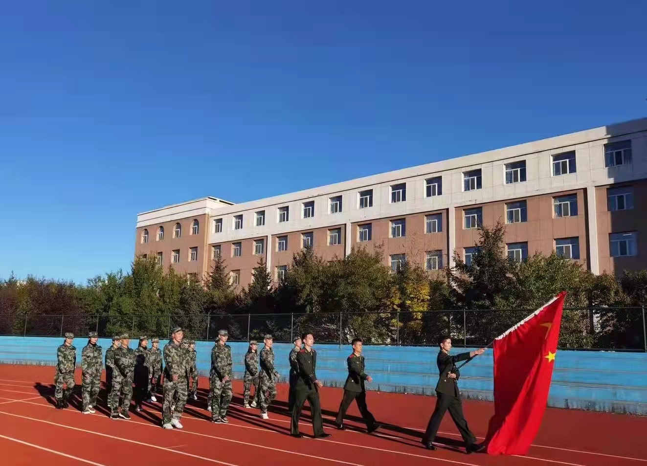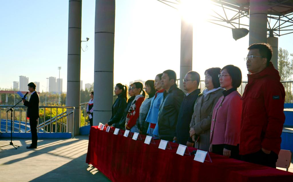 当《义勇军进行曲》奏响时,擎旗手将国旗抛向空中,全体师生肃然而立,向缓缓升起的五星红旗行注目礼,齐唱国歌。