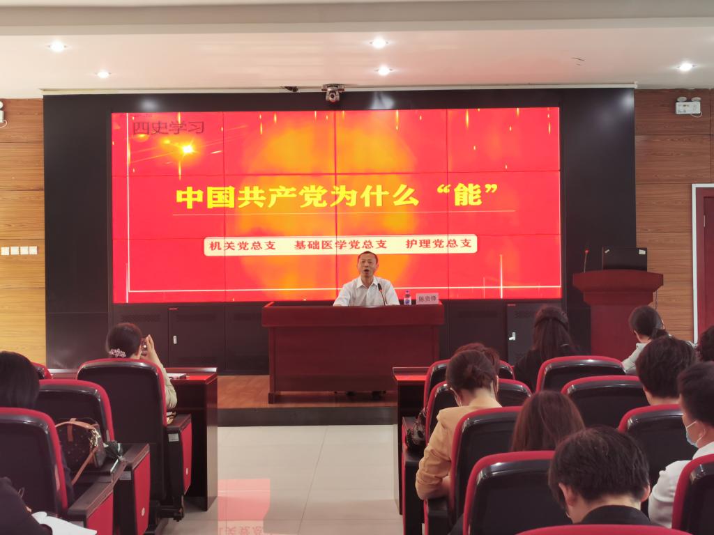 为深入学习贯彻习近平总书记关于学习党史、新中国史、改革开放史、社会主义发展史的重要论述,根据《中共长春医学高等专科学校委员会关于开展“四史”学习教育工作的实施方案》,近日,机关、基础医学和护理党总支联合开展专题学习,邀请学校党委副书记陈贵锋做题为《中国共产党为什么“能”》专题讲座。三个党总支全体党员与护理党总支50名入党积极分子参加学习,讲座由护理党总支书记高寒主持。