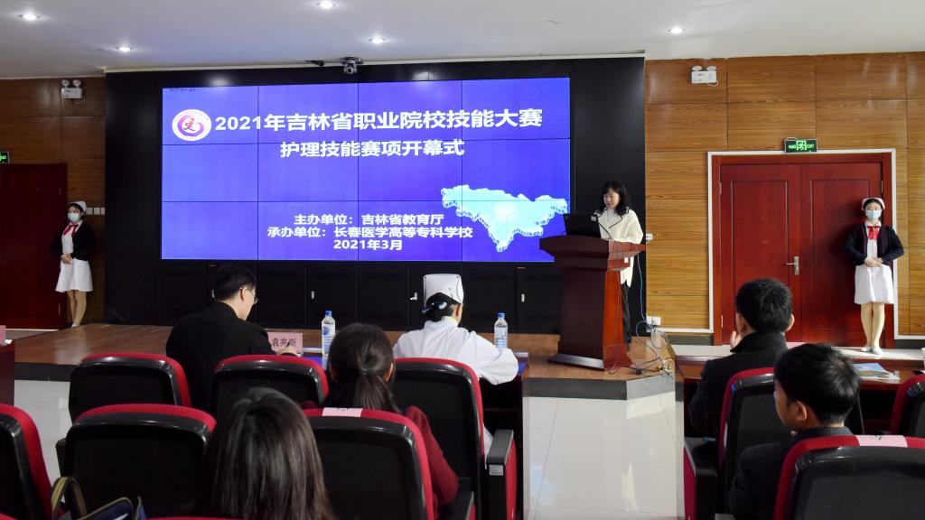 3月29日,2021年吉林省职业院校(高职)组护理技能大赛在我校拉开序幕。受吉林省教育厅委托,本次大赛由我校承办。上午八点,护理技能赛项开幕式在我校善教楼报告厅举行,长春市教育局职业与成人教育处调研员孙立波,吉林省职业院校护理技能大赛仲裁、裁判长周学颖,吉林省职业院校技能大赛赛项监督员张继翔、隋欣、田锐,以及来自省内兄弟院校的领导、领队和指导教师、参赛选手共计70余人参加了开幕式,开幕式由教务处副处长张虹主持。