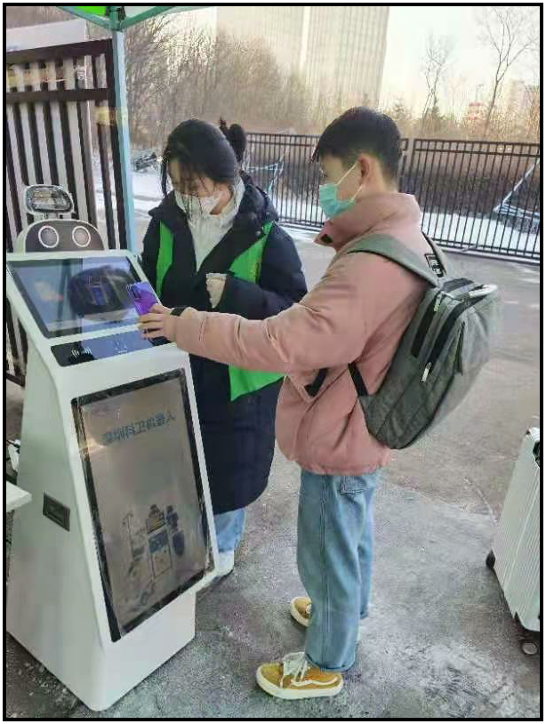 学生一边扫描核验健康码,一边谈着自己切身的感受,“第一次见‘机器人’这样高级的‘开学神器’用来扫码测温,先进、方便更快捷!” 、“熟悉的校园,亲切的老师,辛苦的志愿者,在寒冷的天气里迎接我回家,帮助我运送行李,感谢学校周到的安排。”