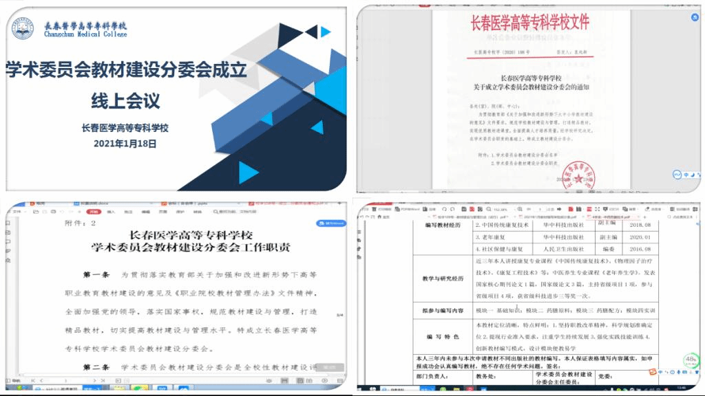 会上,孙莹宣读了《长春医学高等专科学校关于成立学术委员会教材建设分委会的通知》(校字[2020]108号),阐述了教材建设分委员会成立的背景和意义,明确了教材建设分委会工作职责。张虹解读了《长春医学高等专科学校教材建设与管理办法(试行)》(校字[2020]109号),使与会人员明确了教材建设与管理的总章程,教材编写与申报程序,教材选用与申报程序以及教材认定和奖励依据,使教材建设分委会成员在未来开展工作时能够有章可循、有规可依。