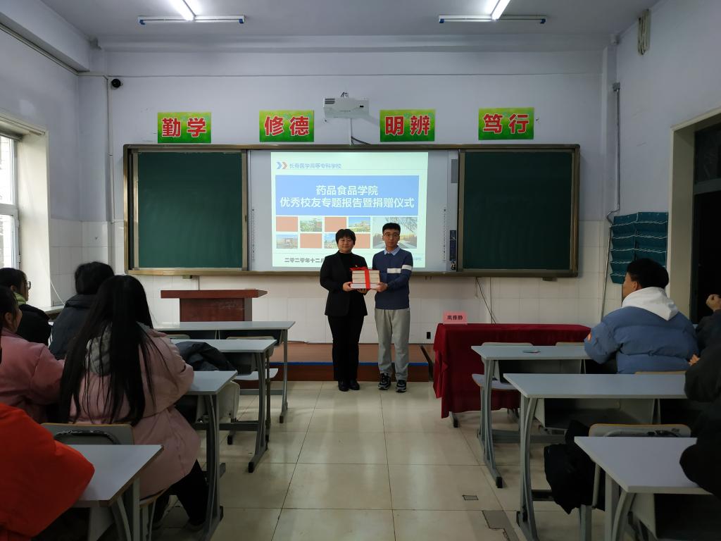 12月17日,药品食品学院在诚教楼5207教室举行优秀校友专题报告暨捐赠活动,药学党总支副书记高雅静、2016级药品经营与管理专业优秀校友潘志强及2020级药品经营与管理专业全体同学出席此次活动,活动由院办主任汪岩主持。