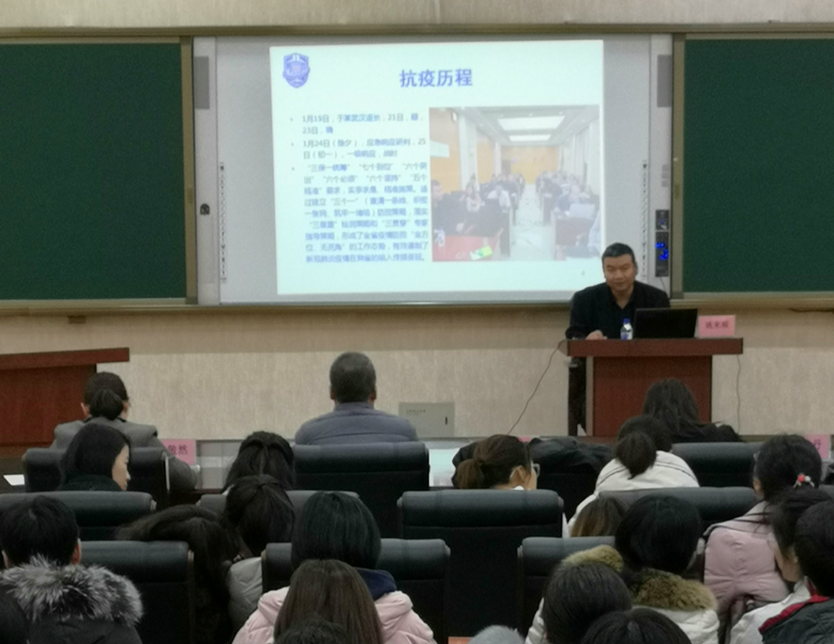 姚来顺从基本情况、抗疫历程、抗疫经验、抗疫精神、殷切希望等五个方面展开,让与会师生认识到防疫工作的艰苦,并以“功成不必在我”的精神境界,和“功成必定有我”的疾控精神与担当,为临床师生彰显他铁骨铮铮战“疫”英雄气概,偶尔间提及对父母、妻子、子女的亏欠又展现柔情似水的一面,朴素的词语、真挚的情怀展现了深沉的家国情怀和负重前行的坚毅!姚来顺的讲座质朴、真切,引发听众不断思索党和国家的伟大、抗疫之路的艰难和医疗卫生人员的舍生忘死。