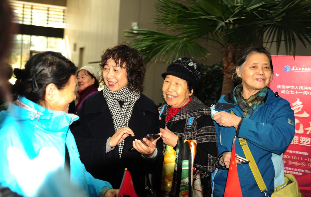 248名老同志身着红心贴、手持小红旗,在讲解员的带领下,参观了长春世界雕塑园主办的红色风采主题雕塑展。此次主题雕塑展以艺术化形式呈现了中华人民共和国成立七十一周年取得的伟大成就,展出的雕塑作品讴歌祖国,讴歌党讴歌人民,既有时代气息,又传承了中国优秀传统,展现了伟人风采和英雄气魄,富有强烈的艺术表现力和感染力。