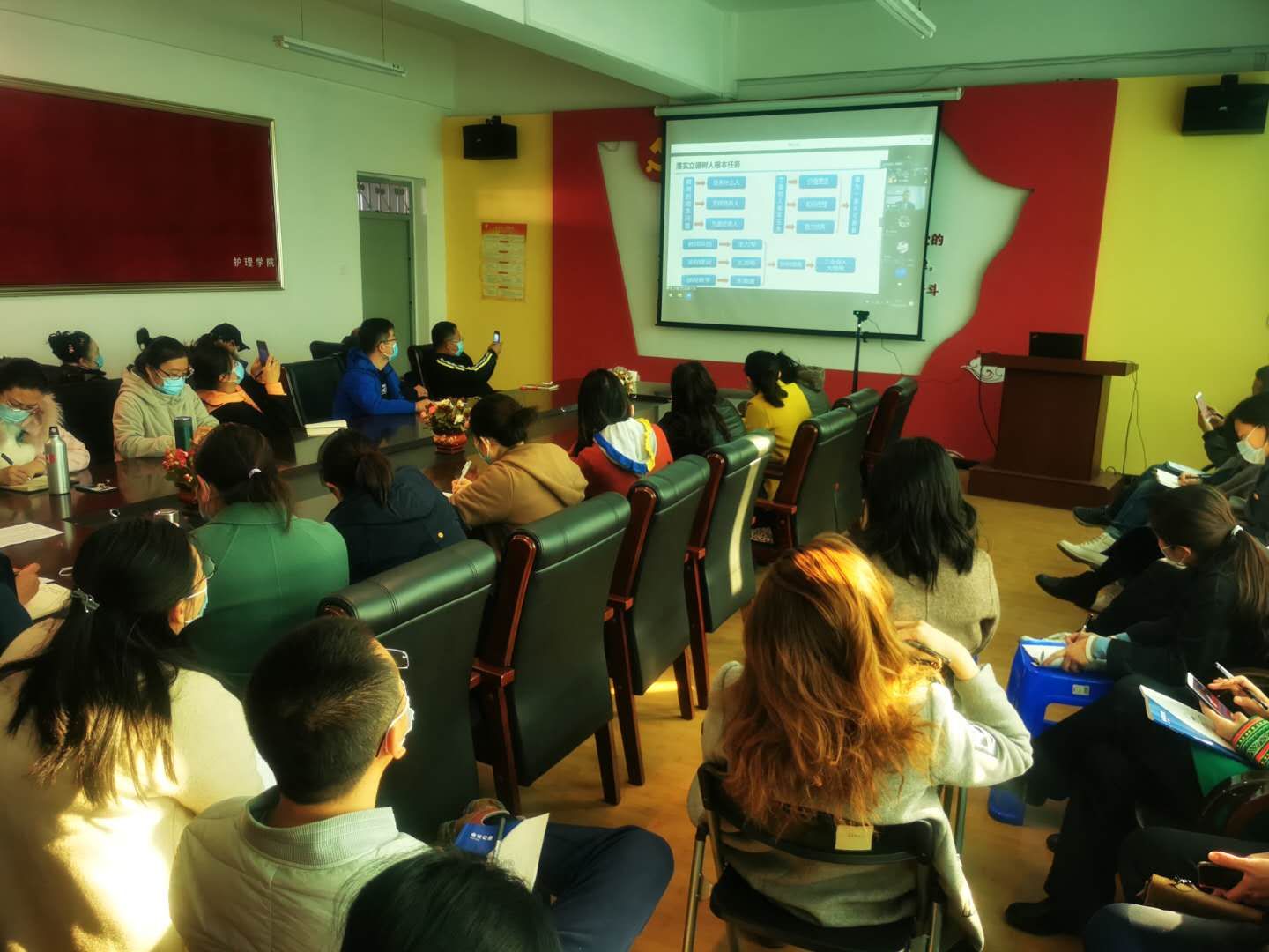 为进一步贯彻落实教育部《高等学校课程思政建设指导纲要》和学校《关于加快构建思想政治工作体系的工作方案》等文件要求,全面推进课程思政建设工作,10月16日上午,临床医学院在善学楼五楼会议室召开课程思政专题报告会。临床医学院副院长杨智源及全体专兼职教师参加了现场视频会议,其他院部无课教师通过腾讯会议共同聆听了专家报告,会议由临床医学院副院长孙晓琪主持。