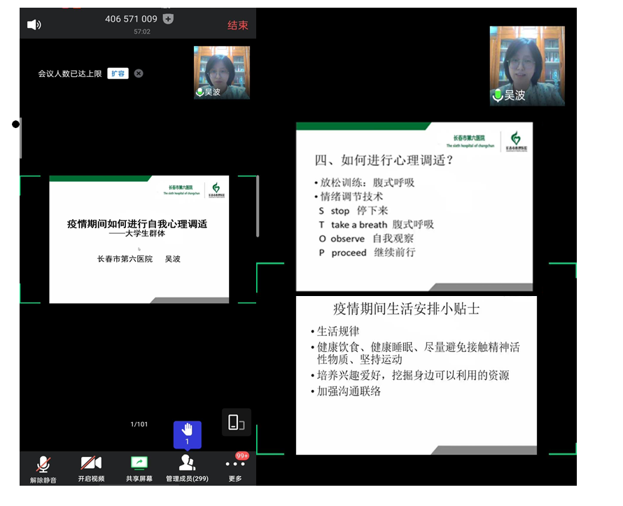 讲座通过腾讯会议进行网络直播,邀请到长春市心理医院心理调适与减压门诊主任吴波进行题为《疫情期间大学生如何进行心理调试》的讲座。吴波老师介绍了面对疫情常见的应激反应、不良的应对方式案例以及如何进行心理调适,解答了大家关于心理疏导的一些问题和困惑。吴老师的讲解通俗易懂、深入浅出,让同学们掌握了疫情期间自我调节的方法,帮助他们有效管理情绪、缓解压力。