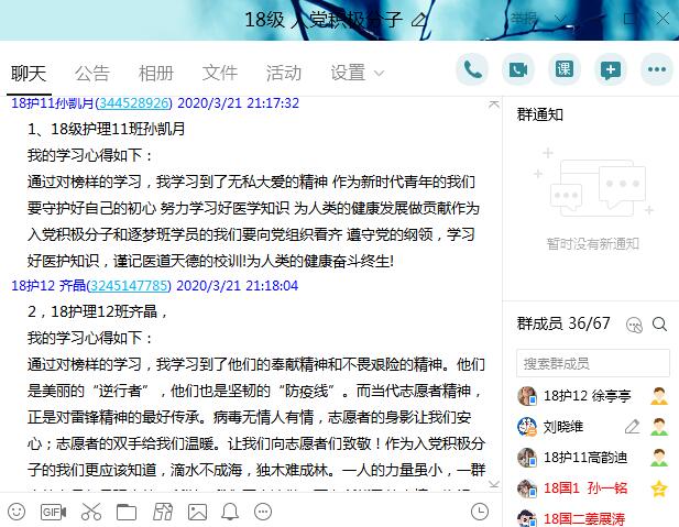 3月22日,通过视频会议召开了学习交流座谈会,座谈会上同学们积极踊跃发表感想,学习党员表示要向榜样学习,勇担战“疫”之责,以扎实过硬的专业素养,站好党员先锋示范岗,努力成为同学们的排头兵;入党积极分子表示作为一名医学生,要更加努力学习专业知识,多看书以完善自己医学知识,与此同时,锻炼过硬本领,为早日成为一名合格的医生做基础,待祖国有需要之时,成为最美的“逆行者"。
