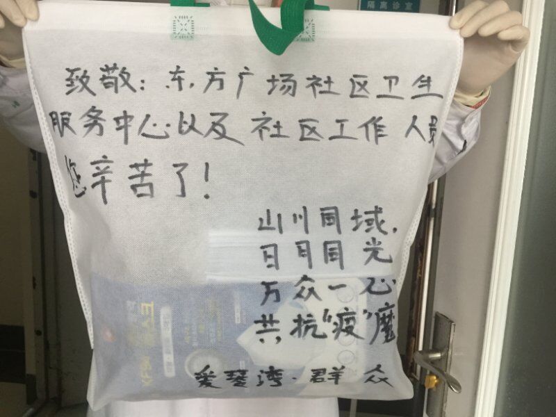 “致敬:东方广场社区卫生服务中心,您辛苦了!”杨先生捐赠的袋子上写着这些话,每一个小小的口罩包装上也写着“长春加油”的字样,让人感到格外的暖心。杨先生表示,看到学校社区卫生服务中心医护人员为了守护群众的健康,不分昼夜、加班加点入户随访特别感动,特别是负责管理他的张程辉同志的耐心服务,让他很是感激,作为一名普通群众,他也想为疫情防控出点力。